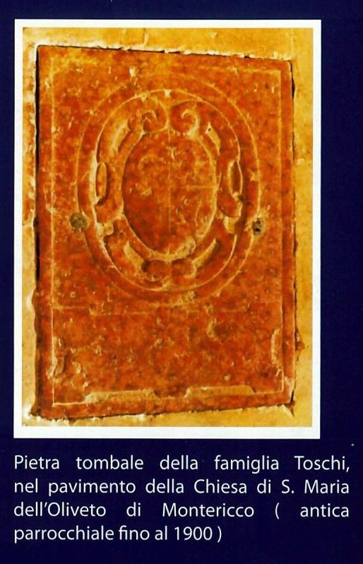 Lo stemma dei Toschi, presente anche nella omonima Cappella, nella parte destra del Duomo di Reggio, è parzialmente visibile anche nel pavimento della nostra chiesa di S. Maria dell’Oliveto dove probabilmente segnala delle sepolture della famiglia. È scolpito in un marmo rosso di Verona con una mano smontata da tre stelle a sei punte. Estintasi casa Manfredi del ramo di Montericco, il 5 agosto 1738 il Duca di Modena Francesco III investe il Marchese Alessandro Frosini della rimanenza dei beni di Montericco. Soppressi i feudi Estensi durante la Rivoluzione Francese, i Frosini perdettero i privilegi sulle loro terre, mentre i Toschi continuarono ad avere la proprietà del Castello, che nel 1901 fu acquistato dai Conti Cassoli, quindi dagli Arduini, dai Gallinari e infine dai Bertani. Il Castello è a pianta trapezoidale e solo la torre è merlata, provvista di piombatoi; in origine tutto il castello doveva essere con i merli che si notano, tamponati, nella facciata che guarda la pianura. Il primo piano è composto da alcune stanze, residenza delle guardie e dei servi, mentre il secondo con una grande sala con soffitto a cassettonie un grande camino era per le feste e i ricevimenti.