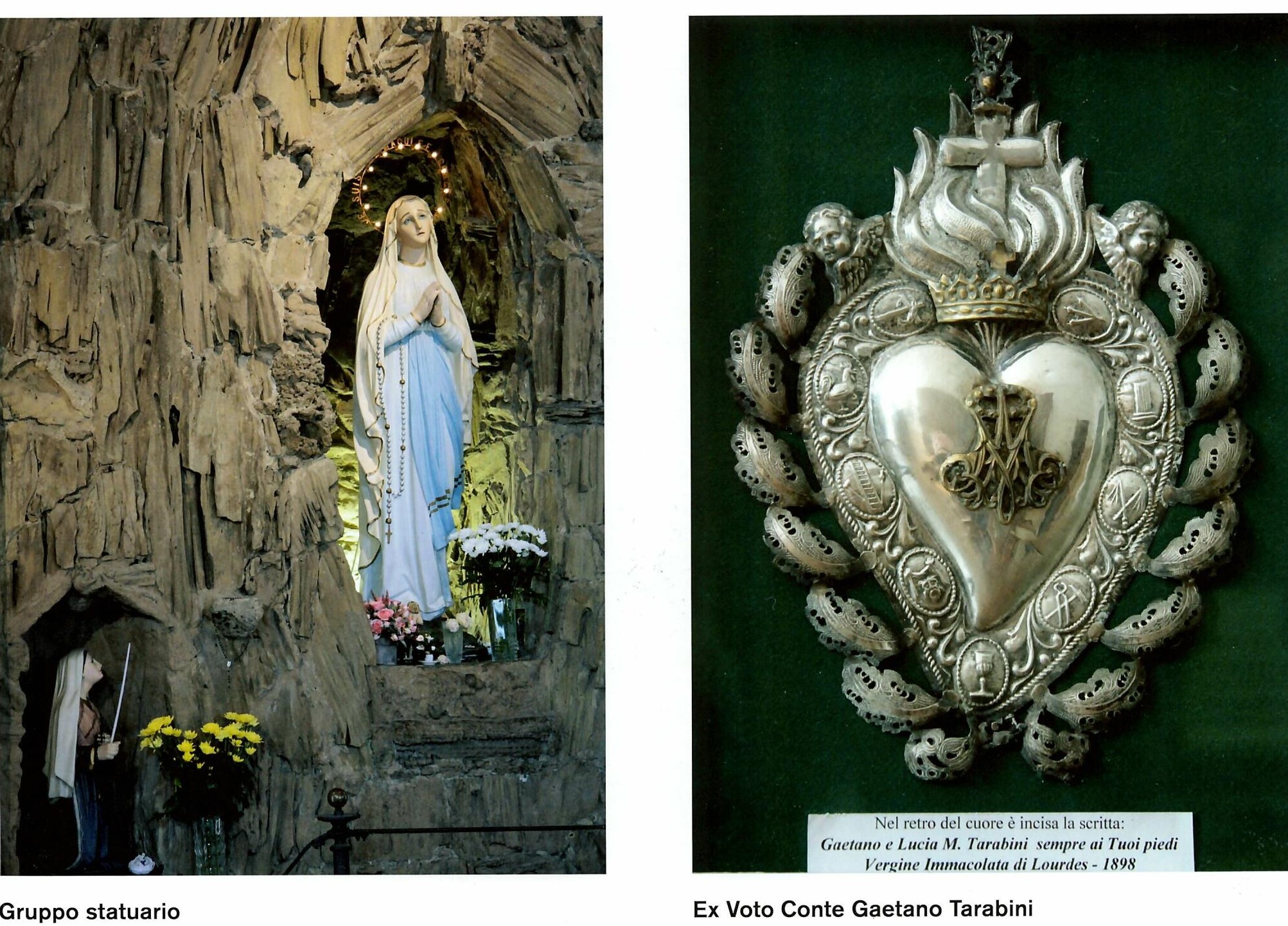 Contro il muro esterno e visibile la suggestiva pietra tombale del Conte Tarabini, che contribuì in gran parte alla spesa di costruzione della chiesa.
