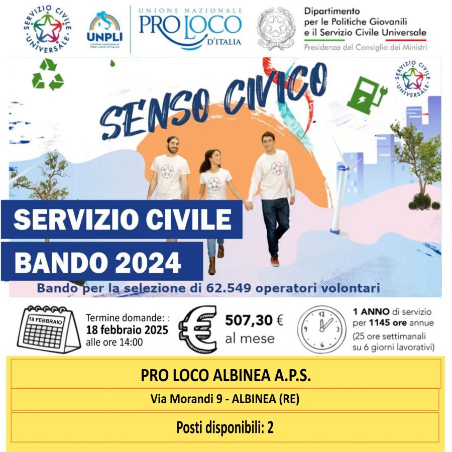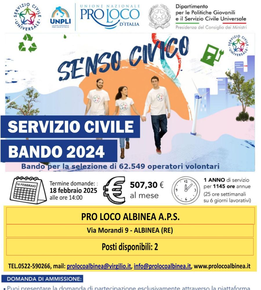 SERVIZIO CIVILE alla Pro Loco Albinea Hai tra i 18 ed i 28 anni? Partecipa al bando di selezione per il Servizio Civile e mettiti a disposizione di Pro Loco Albinea APS per valorizzare la storia e la cultura del nostro territorio! Presenta la domanda entro le 14,00 del 18 febbraio 2025. Contatta Pro Loco Albinea per informazioni e visita il […] Scopri di più