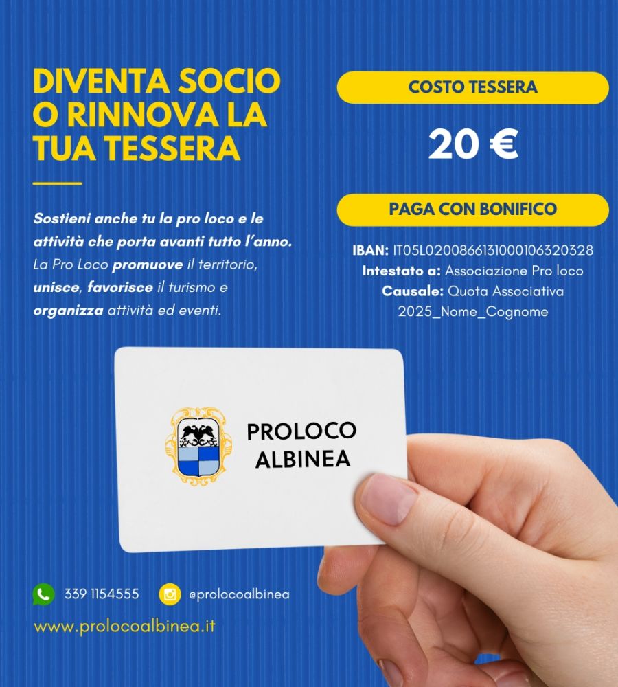 Diventa Socio o Rinnova la tua Tessera Sostieni anche tu la pro loco e le attività che porta avanti tutto l’anno. La Pro Loco promuove il territorio, unisce, favorisce il turismo e organizza attività ed eventi Scopri di più