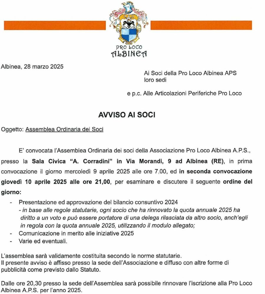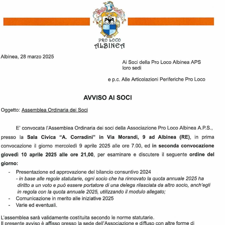 9 aprile 2025 in 1a convocazione – 10 aprile 2025 in 2a convocazione Assemblea dei Soci 2025 E’ convocata l’Assemblea dei Soci dell’Associazione Pro Loco Albinea A.P.S. , presso la Sala Civica “A. Corradini” in Via Morandi, 9 ad Albinea (RE), in prima convocazione il giorno mercoledì 9 aprile 2025 alle ore 7,00, ed in seconda convocazione giovedì 10 aprile 2025 alle ore 21,00, come da convocazione pubblicata. Per partecipare e votare […] Scopri di più