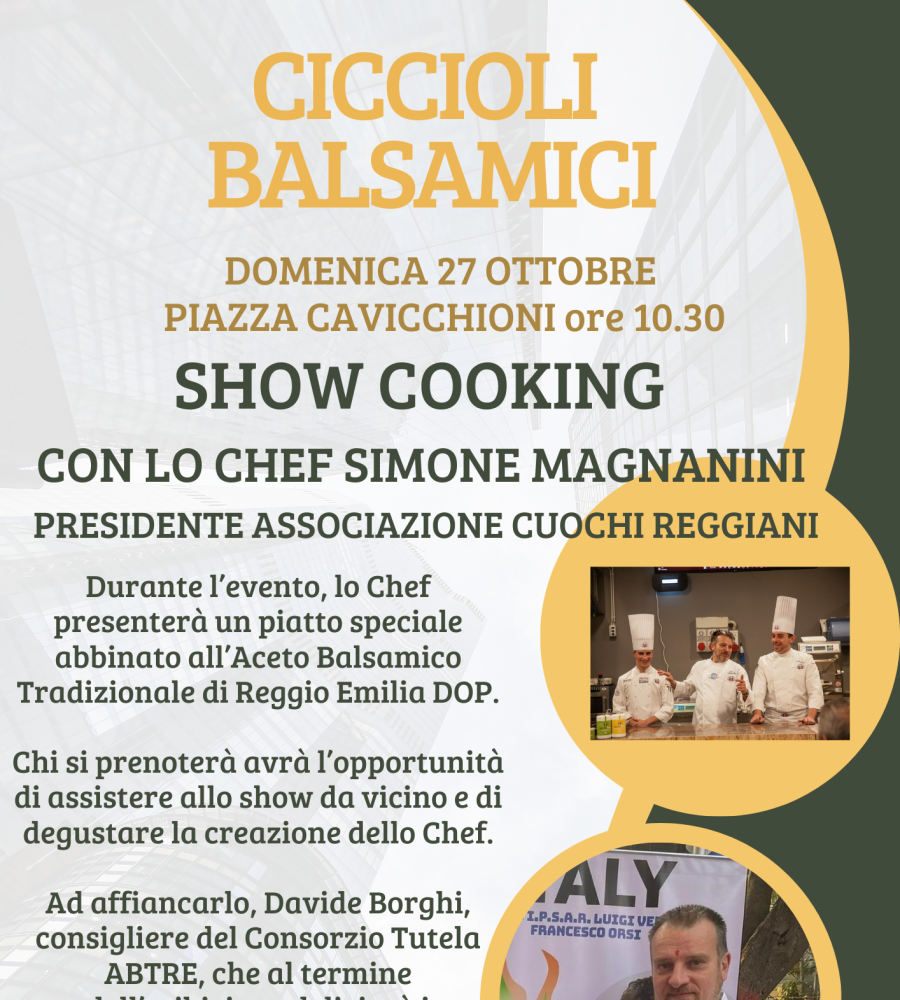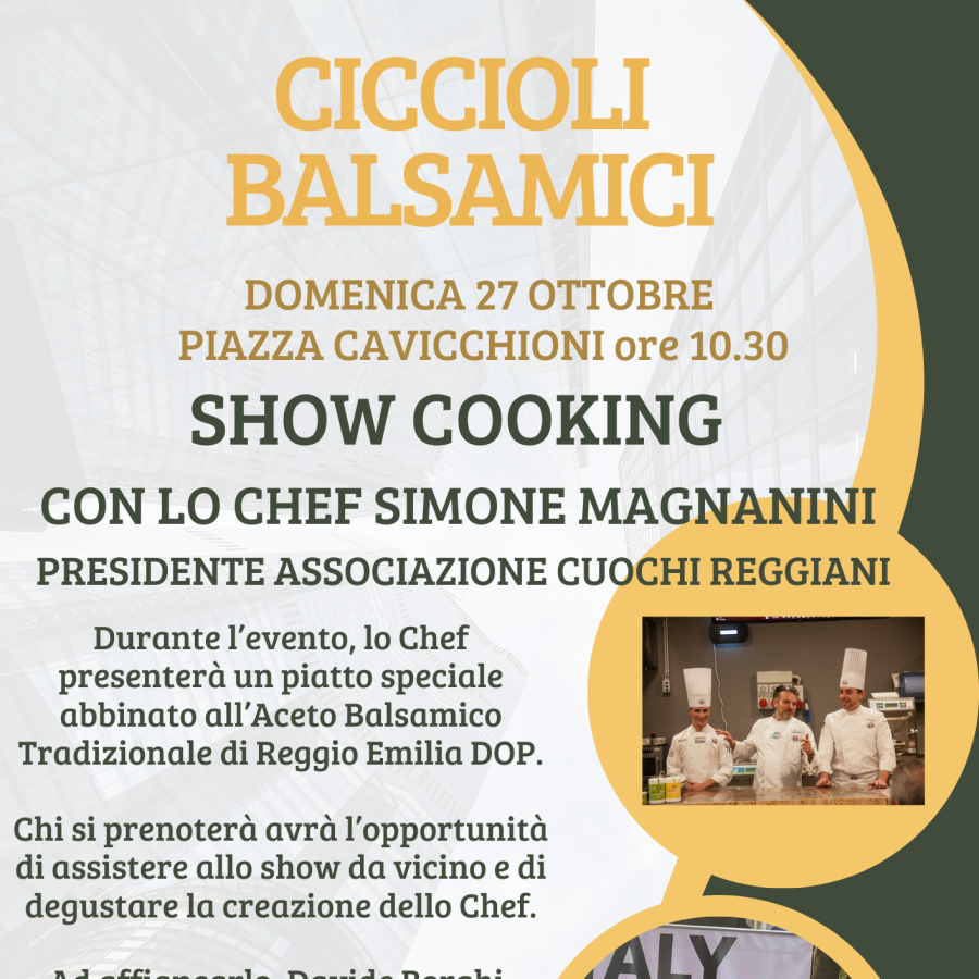 27 Ottobre 2024 ore 10:30 Ciccioli Balsamici SHOW COOKING dedicato al nostro Aceto Balsamico Tradizionale DOP Durante l’evento, lo Chef presenterà un piatto speciale abbinato all’Aceto Balsamico Tradizionale di Reggio Emilia DOP. Scopri di più
