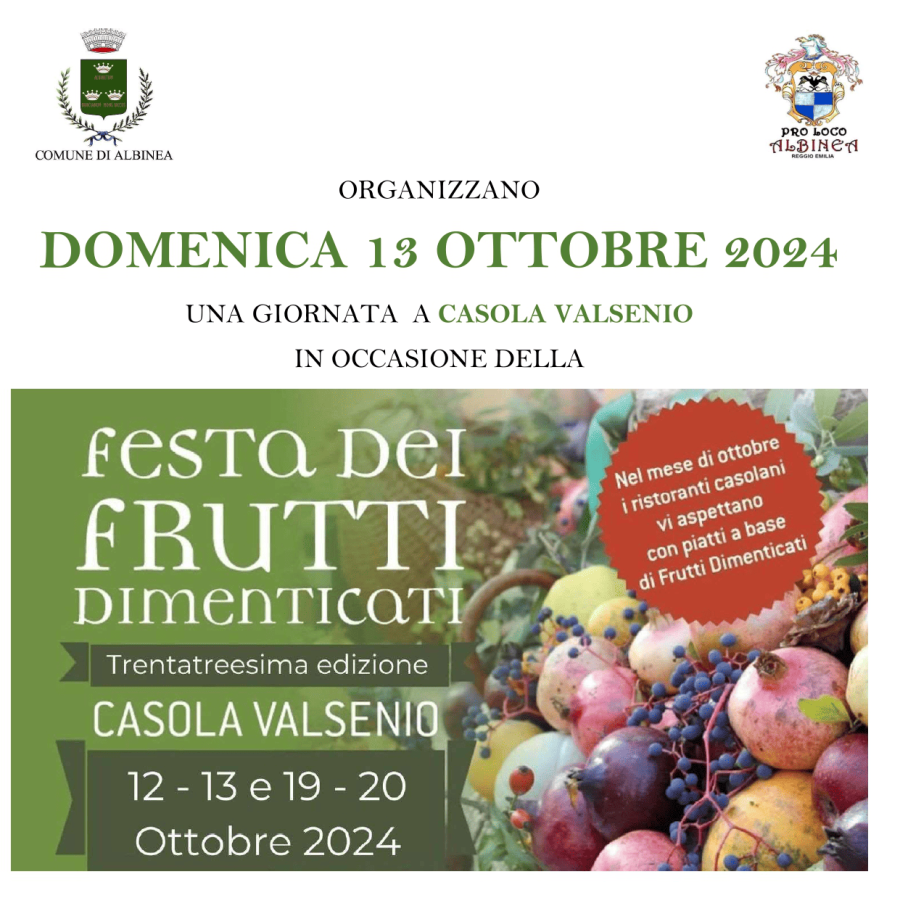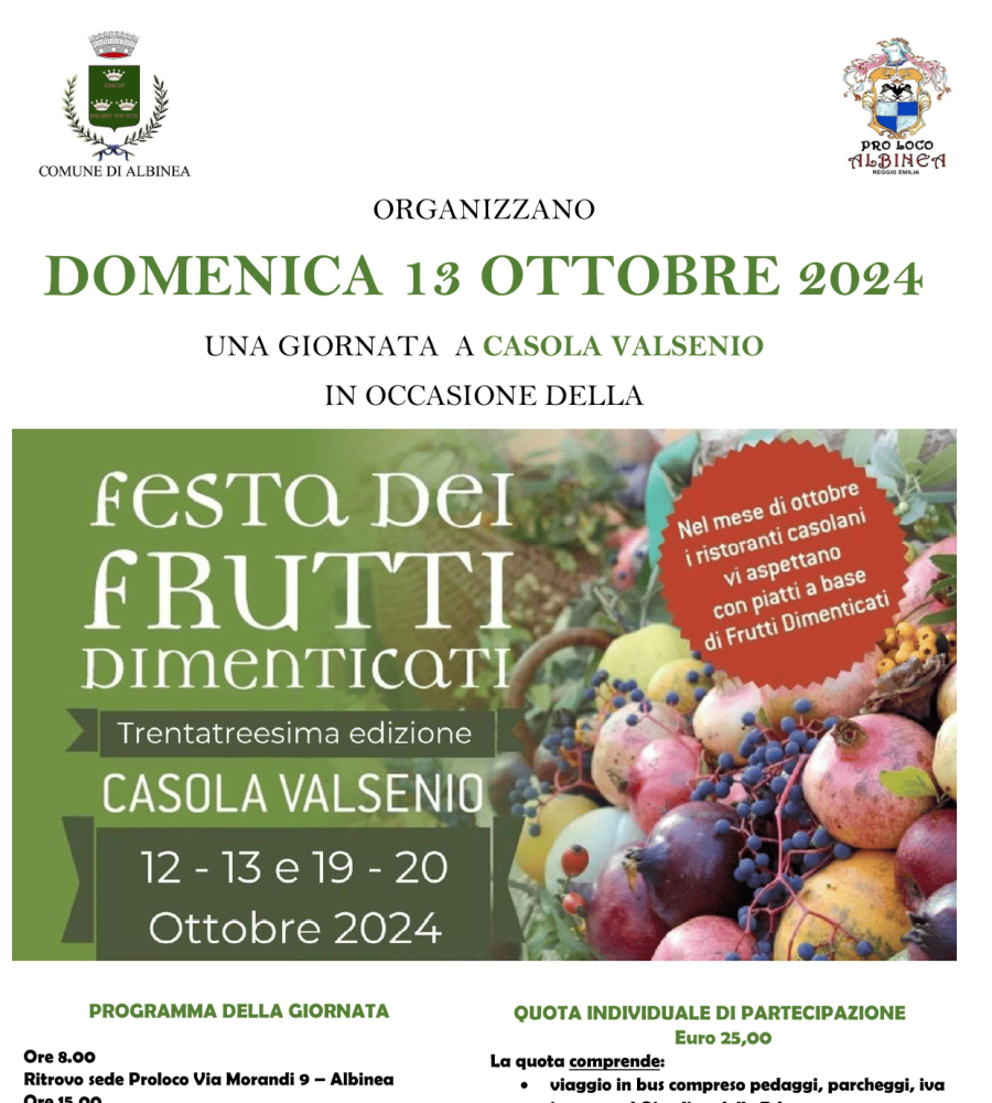 13 ottobre 2024 Festa dei Frutti Dimenticati Ad un anno dal Patto di Amicizia con la comunità di Casola Valsenio… Il 13 ottobre 2024 torniamo alla loro Festa dei Frutti Dimenticati per riscoprire gli antichi sapori di questa terra, incontrare gli amici di Casola Valsenio e visitare il Giardino delle Erbe. Scopri di più