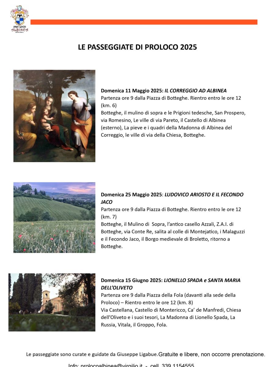 DOMENICA 25 MAGGIO 2025 Partenza ore 9 dalla Piazza di Botteghe. Rientro entro le ore 12 (km. 7) Botteghe, il Mulino di Sopra, l’antico casello Azzali, Z.A.I. di Botteghe, via Conte Re, salita al colle di Montejatico, i Malaguzzi e il Fecondo Jaco, il Borgo medievale di Broletto, ritorno a Botteghe.
