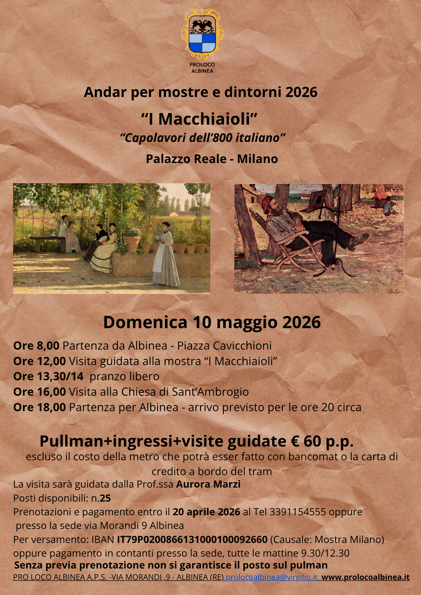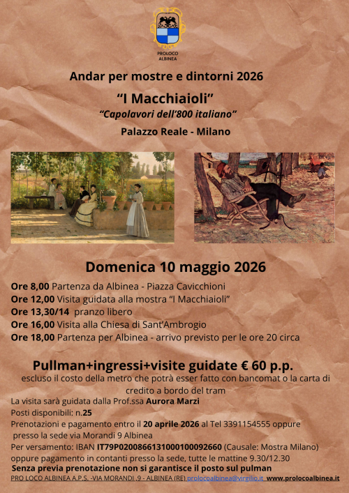 2° appuntamento di “Andar per mostre e dintorni”10 maggio visita a Milano a vedere la mostra “I Macchiaioli” e la Chiesa di Sant’Ambrogio. Senza previa prenotazione non si garantisce il posto sull’autobus. Vi aspettiamo 🙂