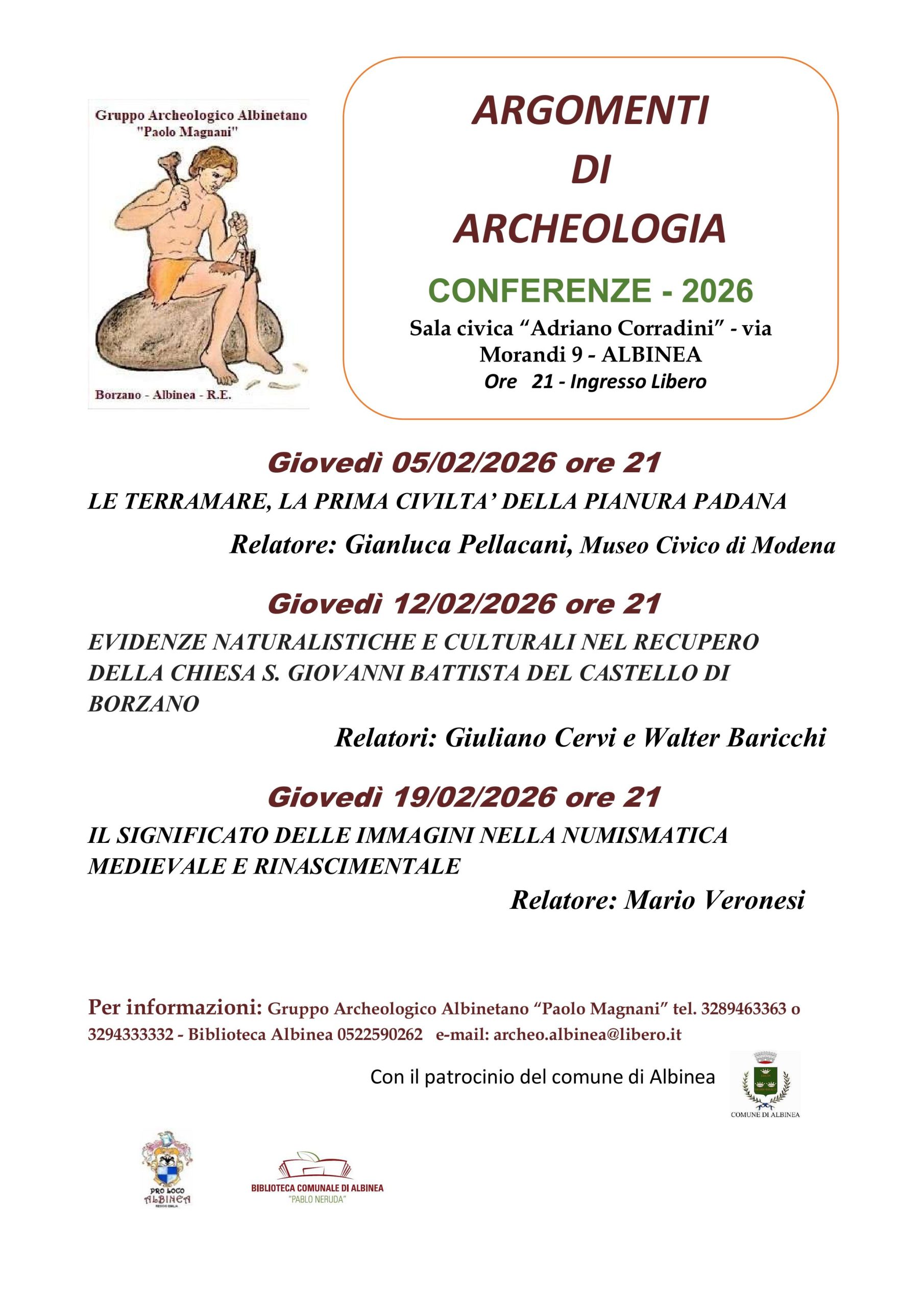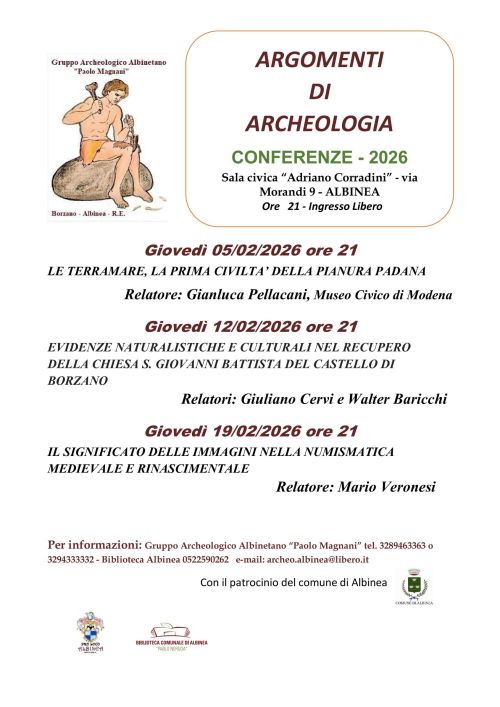 Conferenze di archeologia che si svolgono il 5, 12 3 19 febbraio alle ore 21 presso la sala civica Adriano Corradini