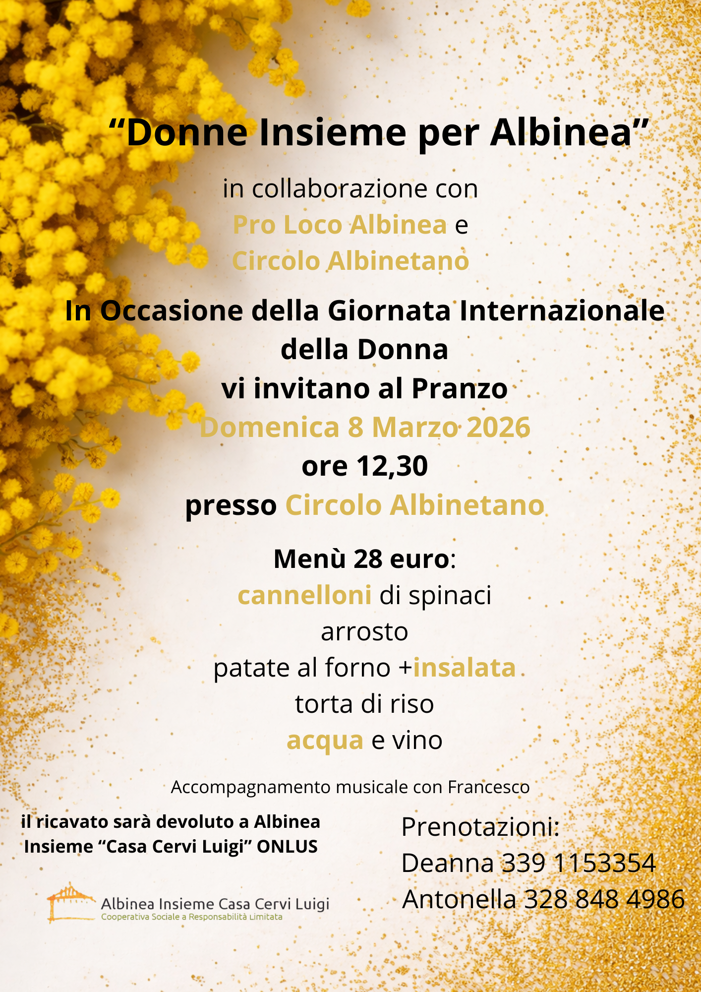 Pranzo in Occasione della Giornata Internazionale della donna, domenica 8 marzo 2026 alle 12,30 presso il Circolo Albinetano. Prenotazione obbligatoria😊