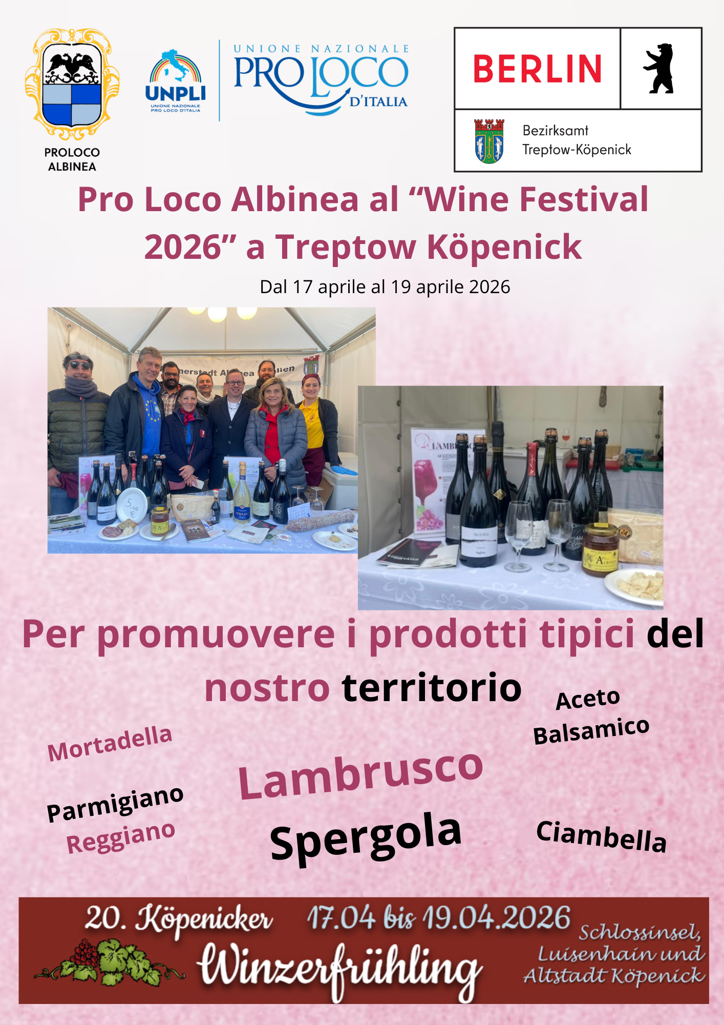 Per la seconda volta ,quest’anno la Pro Loco di Albinea sarà presente al “Wine Festival 2026” a Treptow Köpenick per promuovere i prodotti tipici del nostro territorio: Lambrusco e Spergola, Parmigiano Reggiano, Mortadella, Aceto Balsamico ed infine la Ciambella reggiana
